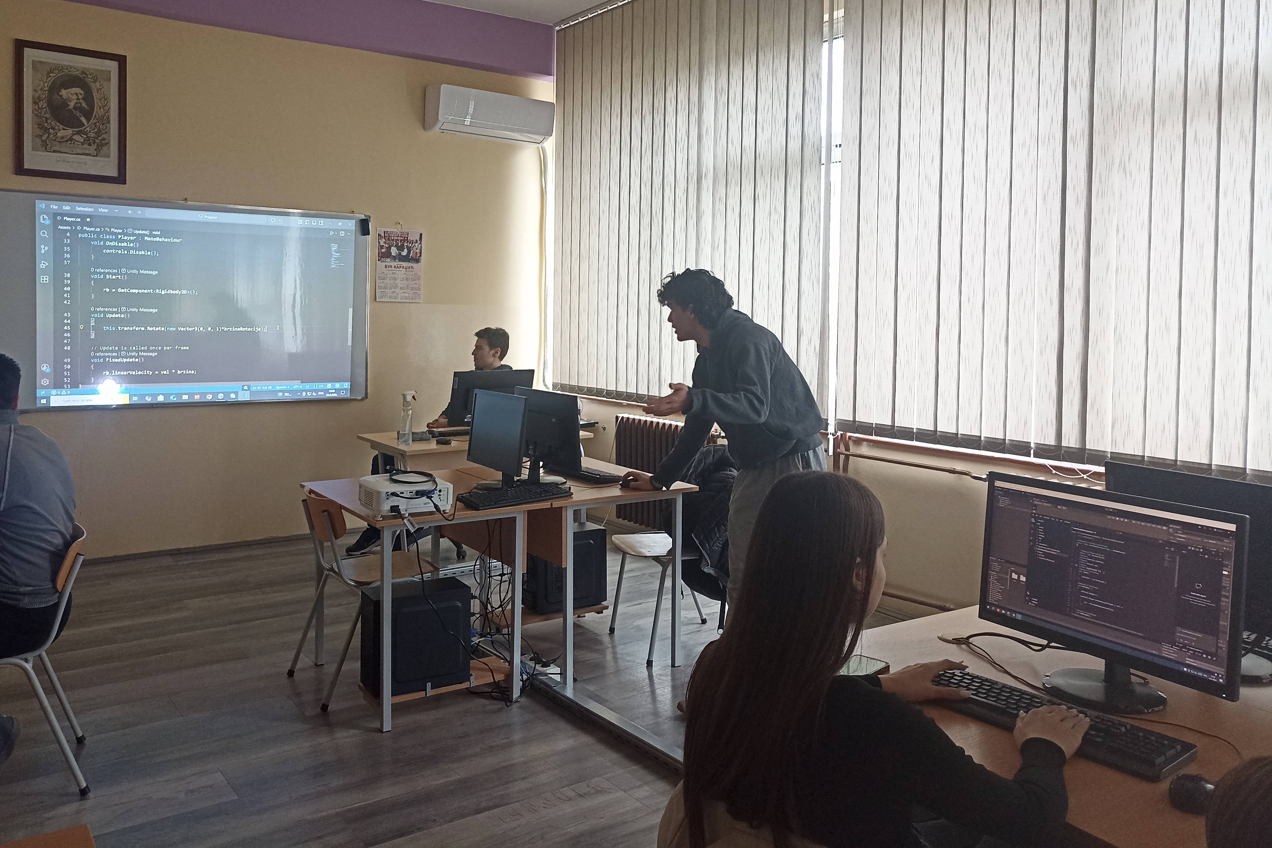Наши вредни ученици ИТ смера, Лука Јовановић, Марко Ђорђевић и Лазар Ратајац, са жељом да несебично поделе своје знање са млађим генерацијама, започели су циклус радионица из области развоја компјутерских игрица (game development).